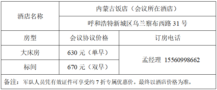 会议合作酒店为内蒙古饭店,请参会人员提前预订,报会议名称“医学生物技术会议”可享受会议优惠价(房型种类齐全,可自行咨询预订)。住宿预订截止日期为8月10日,不能预订者请自行解决。
